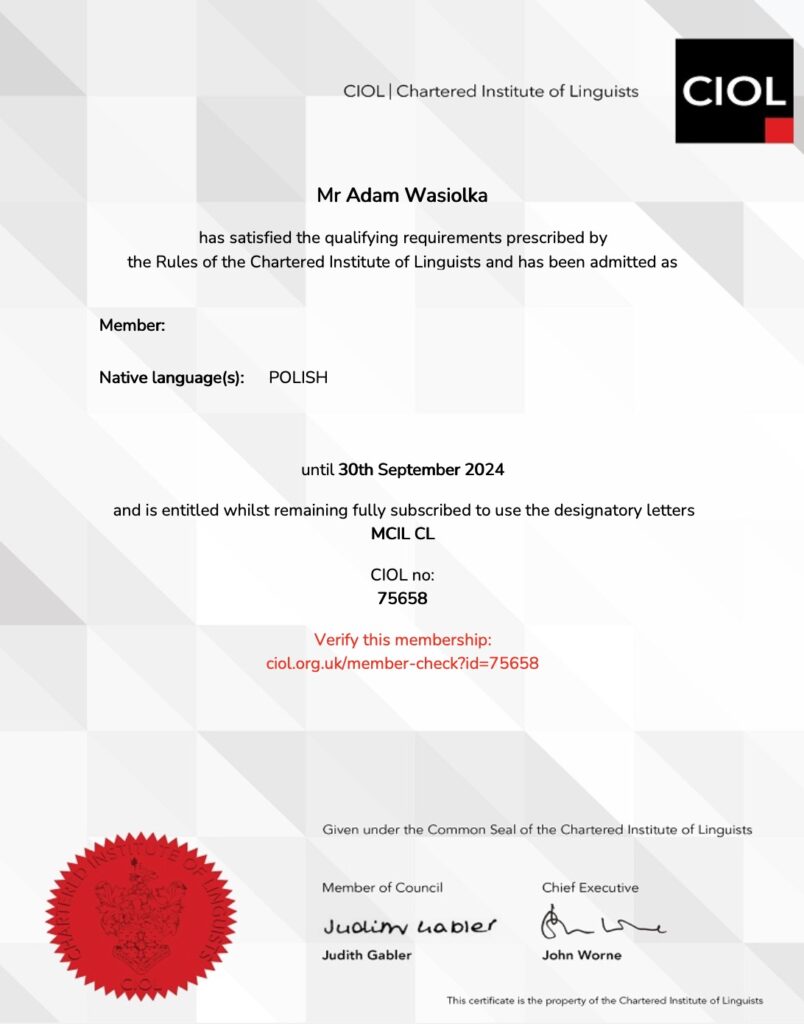 Jestem członkiem The Chartered Institute of Linguists.